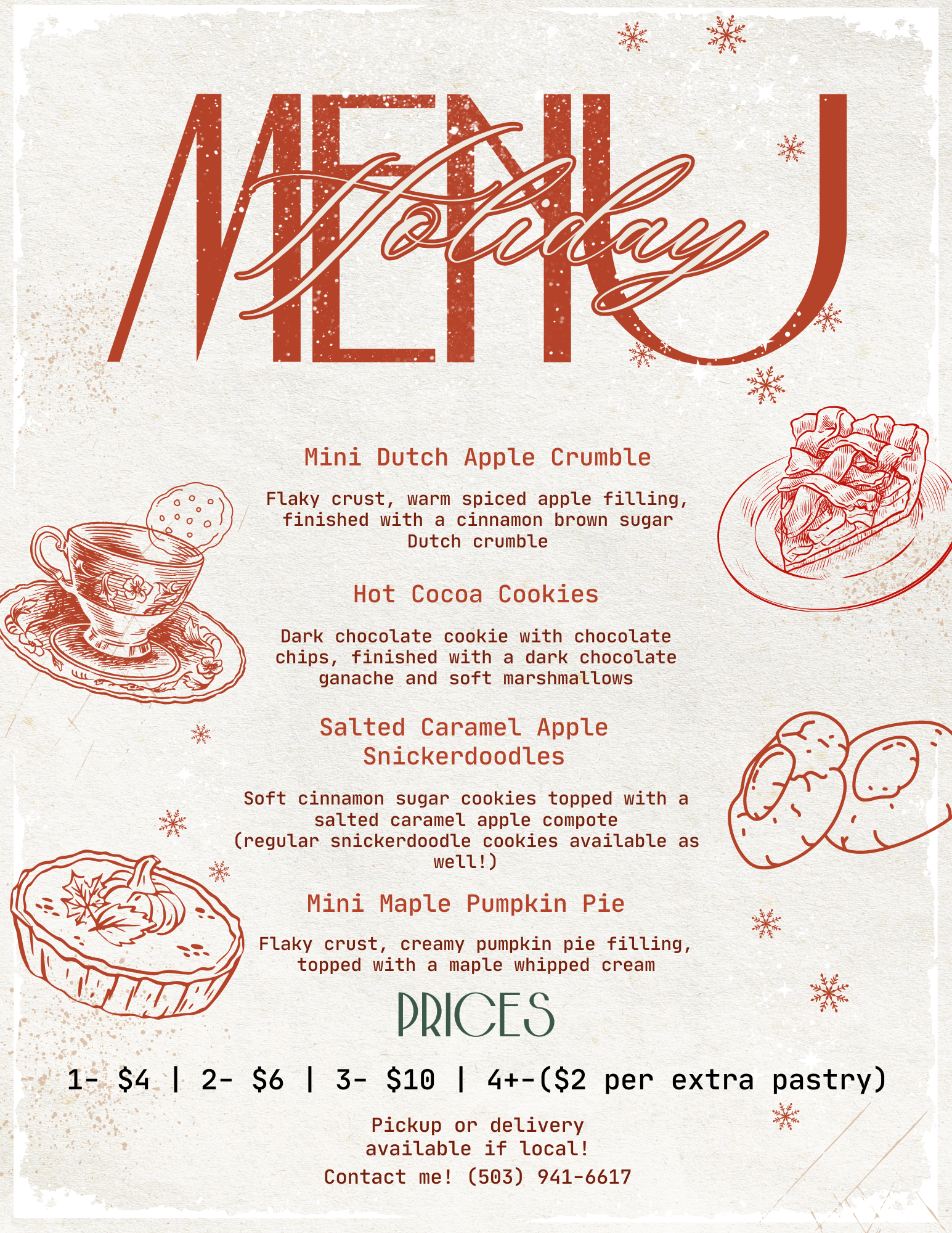ROTATING MENU Mini Dutch Apple Crumble Flaky crust; spiced apple filling; cinnamon sugar Dutch crumble topping Hot cocoa cookies Dark chocolate cookie; chocolate chips; dark chocolate ganache & marshmallows salted caramel apple snickerdoodles (regular available) Cinnamon sugar; salted caramel apple compote topping mini maple pumpkin pie Flaky crust; creamy pumpkin pie; maple whipped cream
